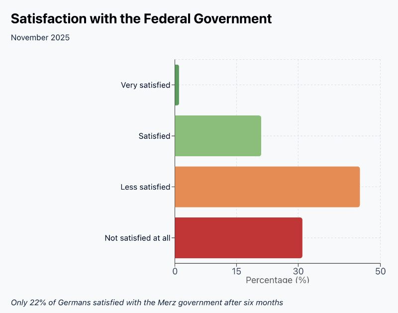 Look at the political polls and pessimism turns into discontent. After six months of the Merz government—the government that promised firmness and fewer quarrels than the infamous traffic-light coalition—only 22 percent say they’re satisfied. The rest grumble. Or shrug. Or despair.