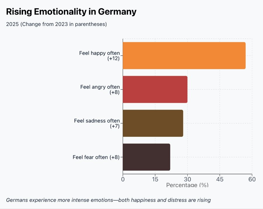 Be careful, though. Behind these indices, the same study warns of something else: emotionality in Germany continues to rise. More people are experiencing strong feelings. Both positive and negative. The polarisation of emotions.