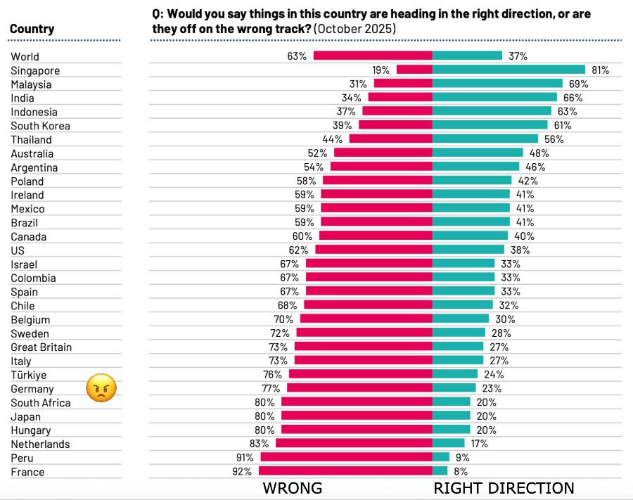 And indeed, in Ipsos’s annual study on global worries, Germany sits a few places below Italy in the lower part of the optimism rankings. 77% of Germans think things are heading in the wrong direction. (73% of Italians think the same—a little Schadenfreude). 70% think the economy is doing badly and won’t improve.